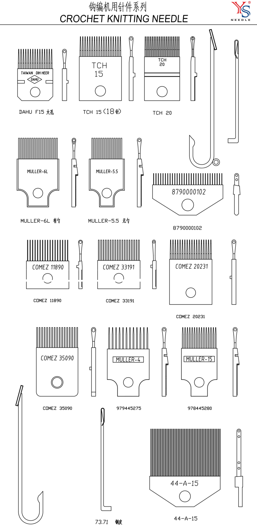 Crochet Machine Needle Parts are core loop-forming elements of crochet machines, primarily spring needles. Characterized by a curved hook at the needle tip and no movable latch, they rely on a presser foot or yarn tension to control the opening and closing of the hook. Through precise vertical reciprocating motion and coordination with yarn guiding and sinking elements, these needles complete yarn laying, hooking, loop formation, and knock-over. They are specifically used for efficiently knitting elastic trims, cords, meshes, and other narrow or special three-dimensional fabrics, serving as key execution components in the narrow fabric weaving sector.