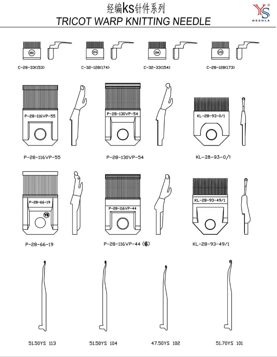 KS needles specifically refer to the compound needle system used in multi-bar tricot warp knitting machines, serving as the core knitting element of KS-type machines. Comprising a needle body with precision guide grooves and a sliding needle pin, they enable high-speed and reliable yarn laying, loop formation, and knock-over through their precise relative movement. Manufactured predominantly from high-quality alloy steel, KS needles are characterized by low inertia and high rigidity. These design features allow them to efficiently execute complex lapping movements with multiple guide bars, ensuring extremely stable production of a wide range of fabrics—from plain textiles to intricate meshes and jacquard structures. As a critical foundational component, they play a key role in achieving both high efficiency and superior quality in the production of premium warp-knitted fabrics.